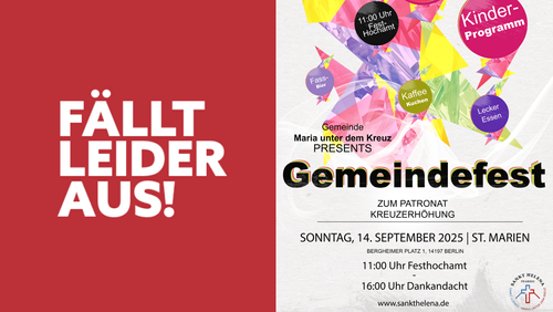 Aufgrund des Gemeindefestes in St. Marien entfällt die Hl. Messe in Heilig Kreuz. Das Gemeindefest beginnt mit einem Festgottesdienst um 11 Uhr in St. Marien.