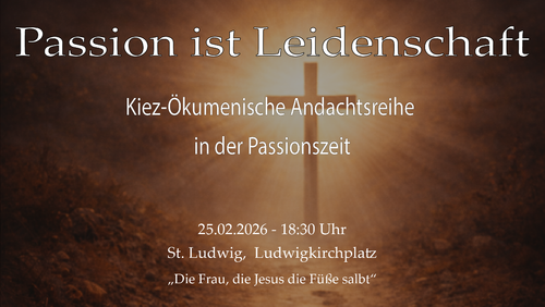An diesem Abend startet um 18.30 Uhr in St. Ludwig eine Reihe ökumenischer Passionsandachten, die sich in verschiedenen Kirchen unserer ökumenischen Geschwister fortsetzt. Kreuzweg und Hl. Messe entfallen daher. Termine, Themen und Orte der Andachtsreihe finden Sie im Aushang und auf der Homepage unter "Neuigkeiten".