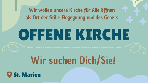Der Gemeinderat von Maria unter dem Kreuz lädt am 18. Januar alle Interessierten, die sich für eine Offene Kirche in St. Marien engagieren möchten, zu einem Austausch nach dem Gottesdienst in den Gemeindesaal am Bergheimer Platz ein.