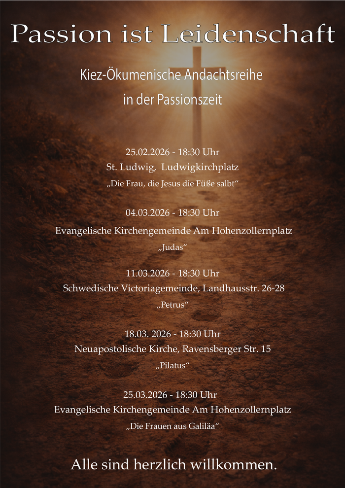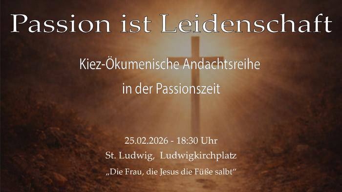 Am 25.2. startet um 18.30 Uhr in St. Ludwig eine Reihe ökumenischer Passionsandachten, die sich in verschiedenen Kirchen unserer ökumenischen Geschwister fortsetzt. Kreuzweg und Hl. Messe entfallen daher!